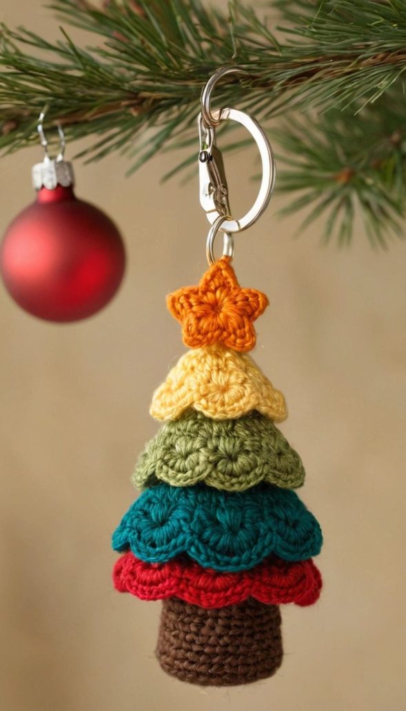 If you want to decorate your tree, small beads, buttons, or sequins can be sewn on to resemble ornaments. A tiny yellow or gold star can be crocheted separately and stitched to the top for a festive finishing touch. These small details transform the keychain into something extra special.
