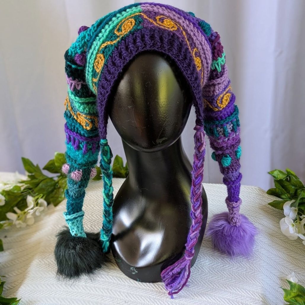 This crochet pattern typically features several triangular points extending from a circular base, each tip often adorned with small pom-poms or bells. These elements give the Fool’s Cap – Pattern its signature playful look, making it instantly recognizable and full of personality.