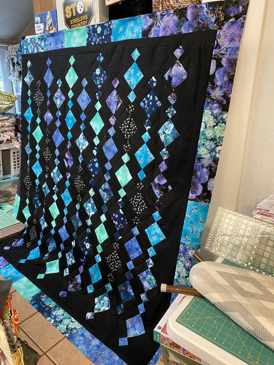 The background fabric should complement but not overwhelm the diamonds. Neutral shades like white, cream, gray, navy, or black are popular choices because they allow the cascading shapes to shine. Soft tone-on-tone prints can also add a touch of texture without distracting from the overall design.
